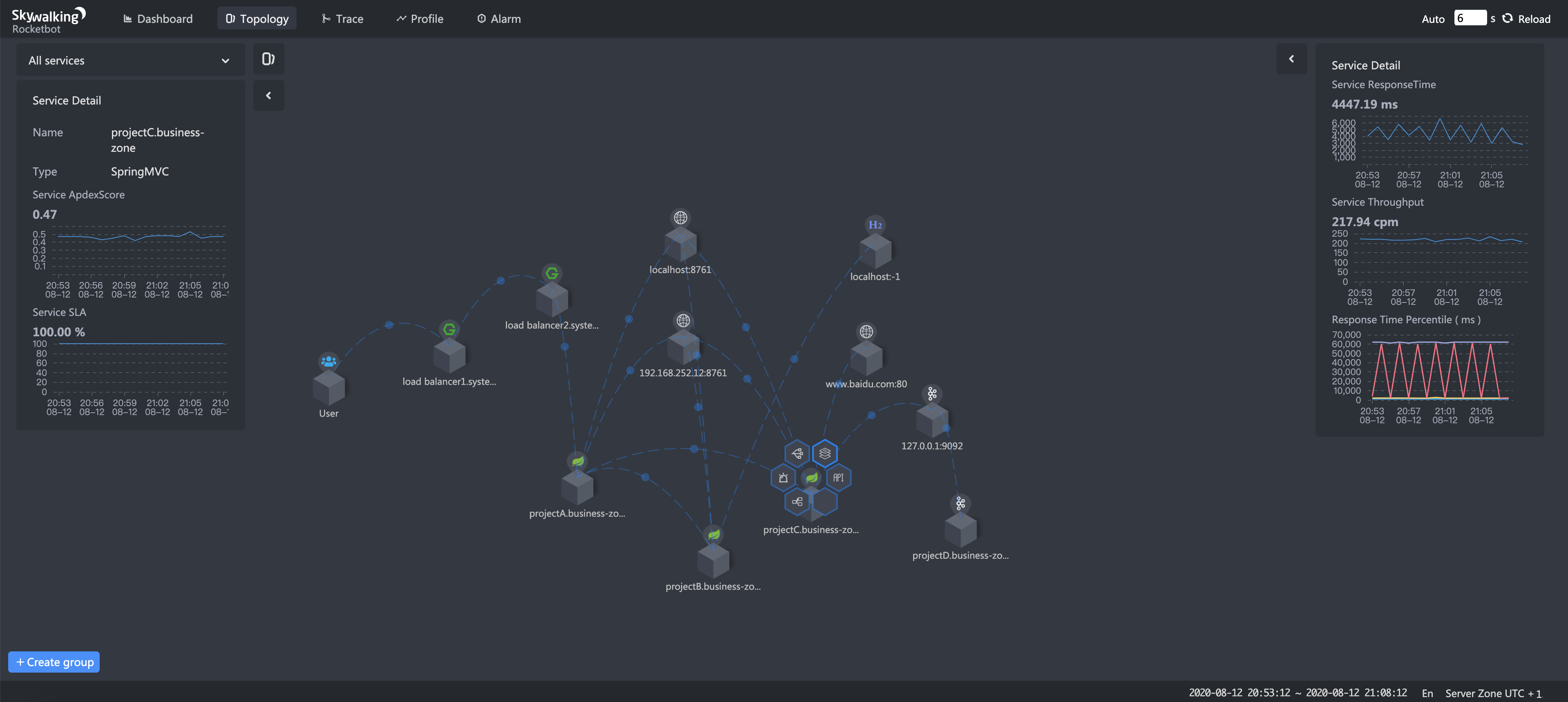The service topology map is required from Ops and SRE teams for the NOC dashboard and confirmation of system data flow. SkyWalking uses the STAM (Streaming Topology Analysis Method) to analyze topology from the traces, or based on ALS (Envoy Access Log Service) in the service mesh environment. This topology and metrics of nodes (services) and lines (service relationships) can’t be pulled from simple metrics SDKs.