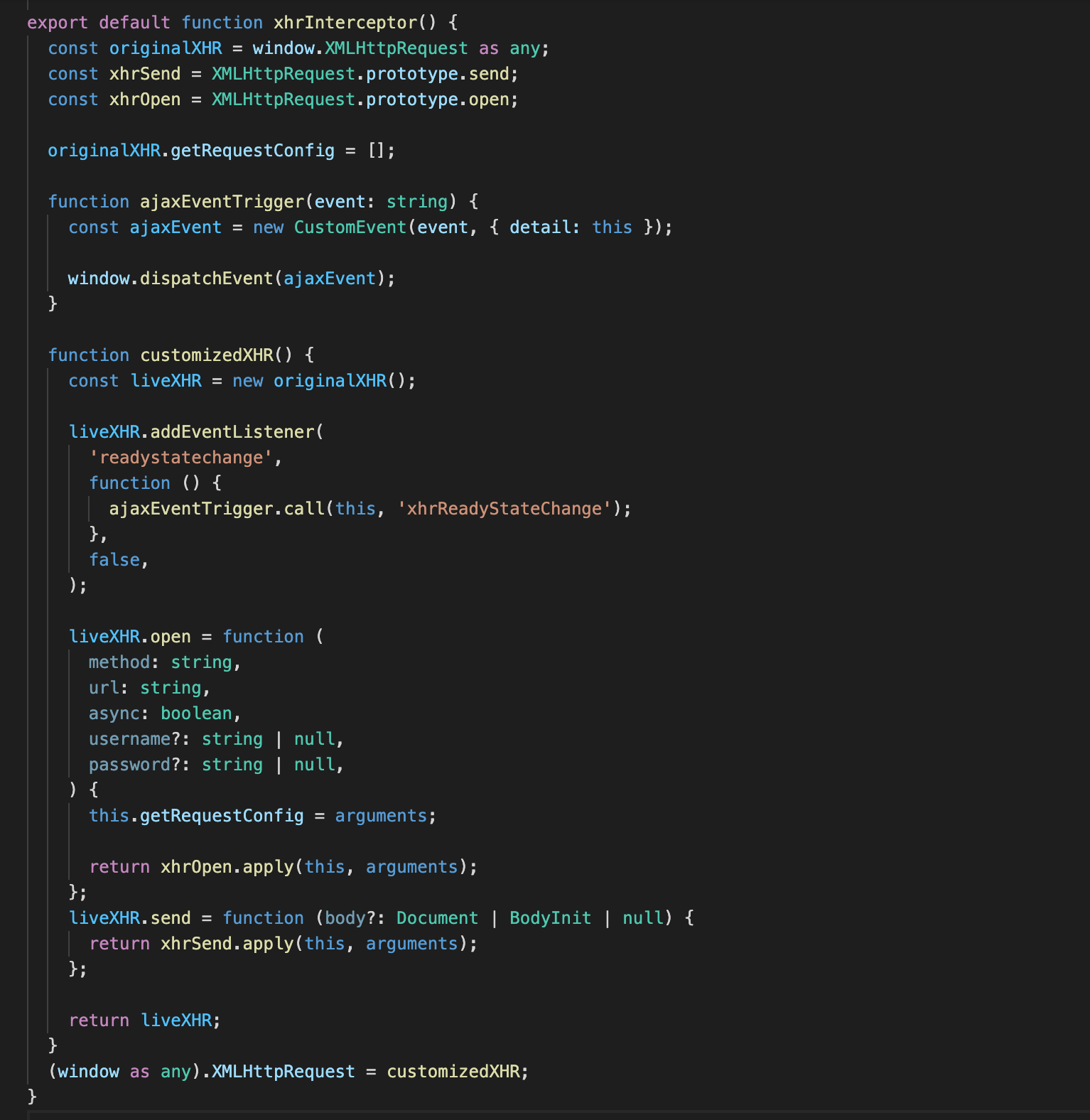 As you can see, it creates a promise and a new XMLHttpRequest object. Because the code of the fetch is built into the browser, it must monitor the code execution first. Therefore, when we add listening events, we can’t monitor the code in the fetch. Just after monitoring the code execution, let’s rewrite the fetch: