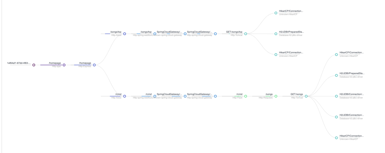 这些插件给各组件的核心环节埋点,采集数据上报给SkyWalking后,Web端的【追踪】页面就能勾勒出丰满完美的请求执行链路;这对架构师理解真实架构,测试同学验证逻辑变更和分析性能损耗,开发同学精准定位问题都非常的有帮助。这里借官方在线Demo的截图一用(抱歉后端程序员,五毛特效都没做出来,丰满画面还请自行脑补)