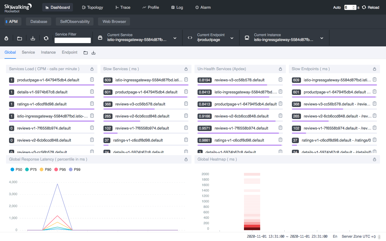 kubectl -n istio-system logs -f $(kubectl get pod -A -l "app=skywalking,release=skywalking,component=ui" -o name)。 - 确保 WebUI 右下方的时区设定在